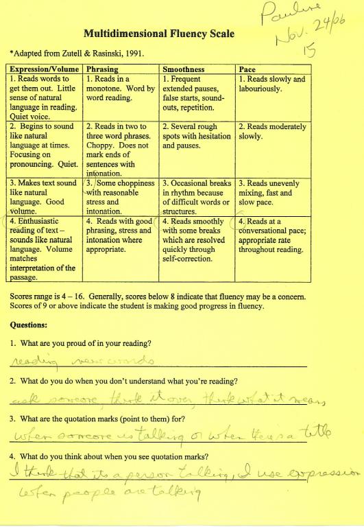 This gallery has a marked up "Multidimensional Fluency Scale" and the reading passage that was used for assessment.* click on image to view full size.