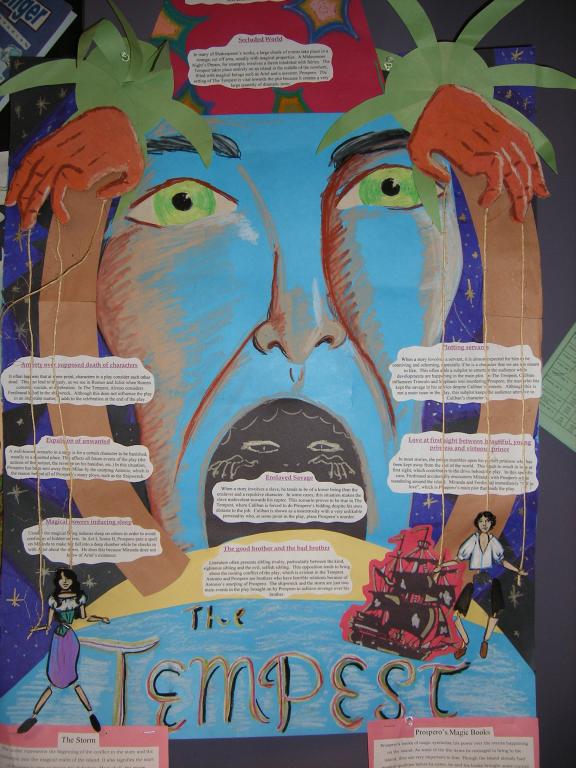 Poster by Polina, Sine, and Wade: Comedy archetypes in Shakespeare's _The Tempest_. Note the visual arrangement of the poster: Prospero is the master puppeteer pulling the strings of the play's events.* click on image to view full size.