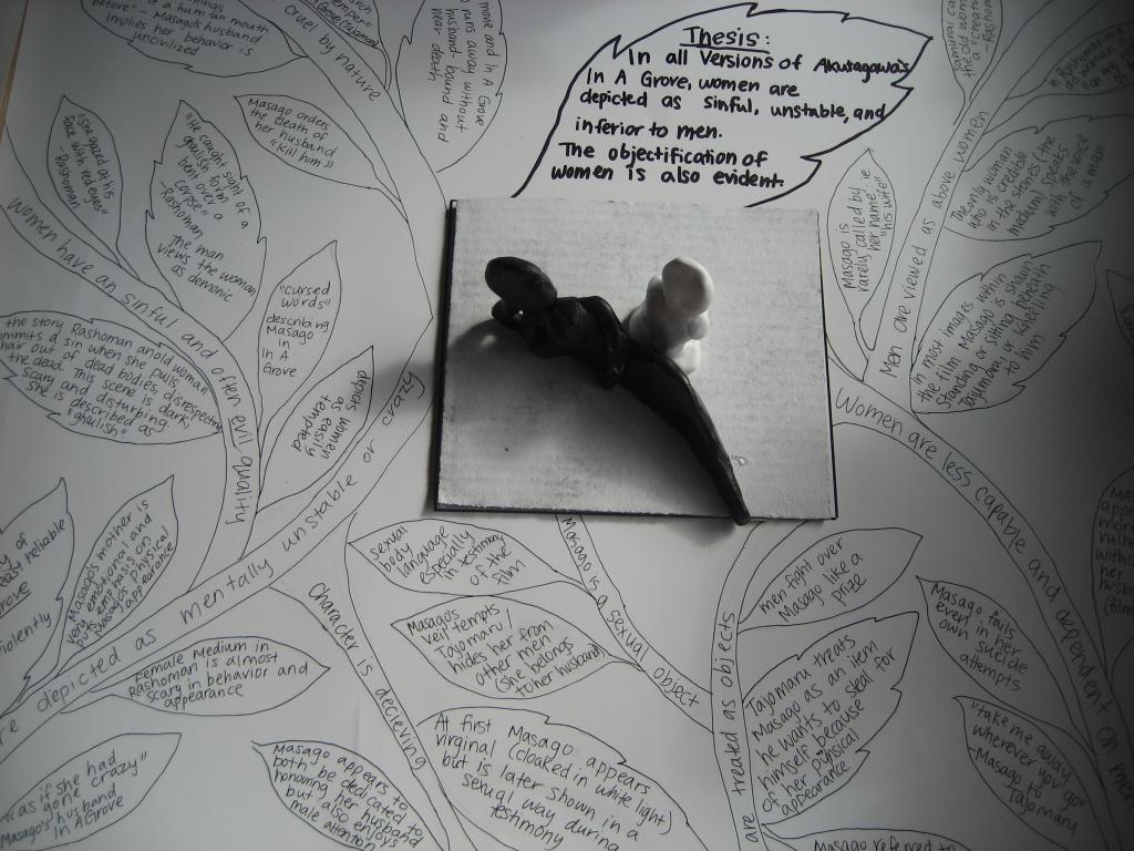 Here we can see examples of some of the projects created by the English 12 students studying these three works, Akutagawa's "Rashomon," and "In a Grove" and Kurosawa's film _Rashomon_. Using project guidelines (see Gallery: Project Requirements), students approach the task in a variety of ways and with variety in materials, all of which allow semiotic analysis of the texts and the linking of a common theme, though themes vary.