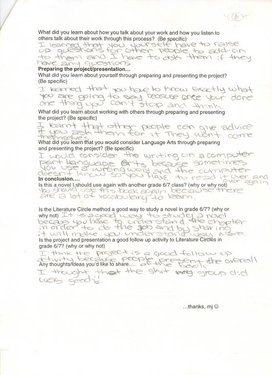 Upon completion of the novel I make time to find out what the students thought of the process. This is the first time through a reflection for new students in my class so I ensure there is time to explain that I use their reflections to improve my practice. I am their audience.