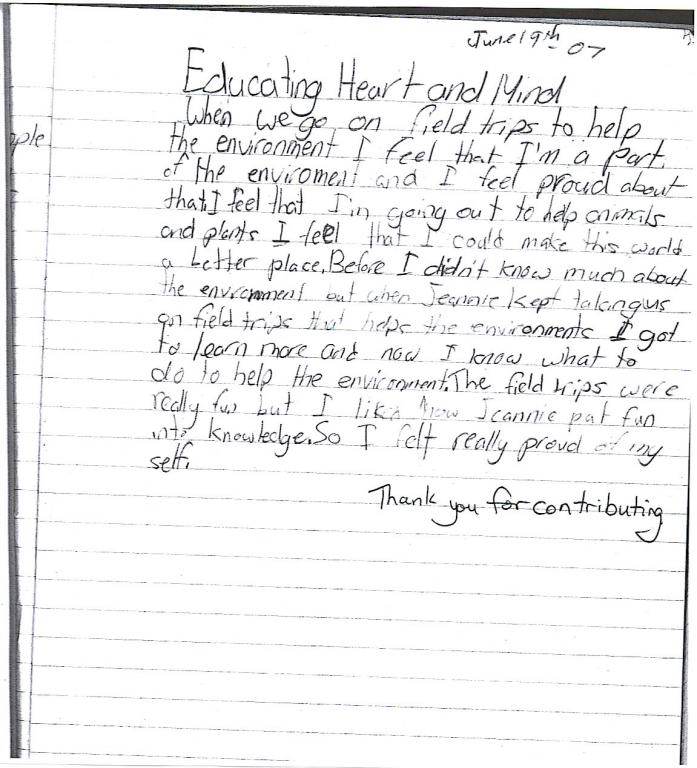 I asked the students to read what I had written about "Heart and Mind" and particularly "Social Responsibility" in these accounts. I asked them to respond honestly as to whether participating in these socially responsible initiatives has had any kind of impact on each of their identities. This is the students' writings completed while I was not in the room. I also asked them not to put names on writing.* click on image to view full size.