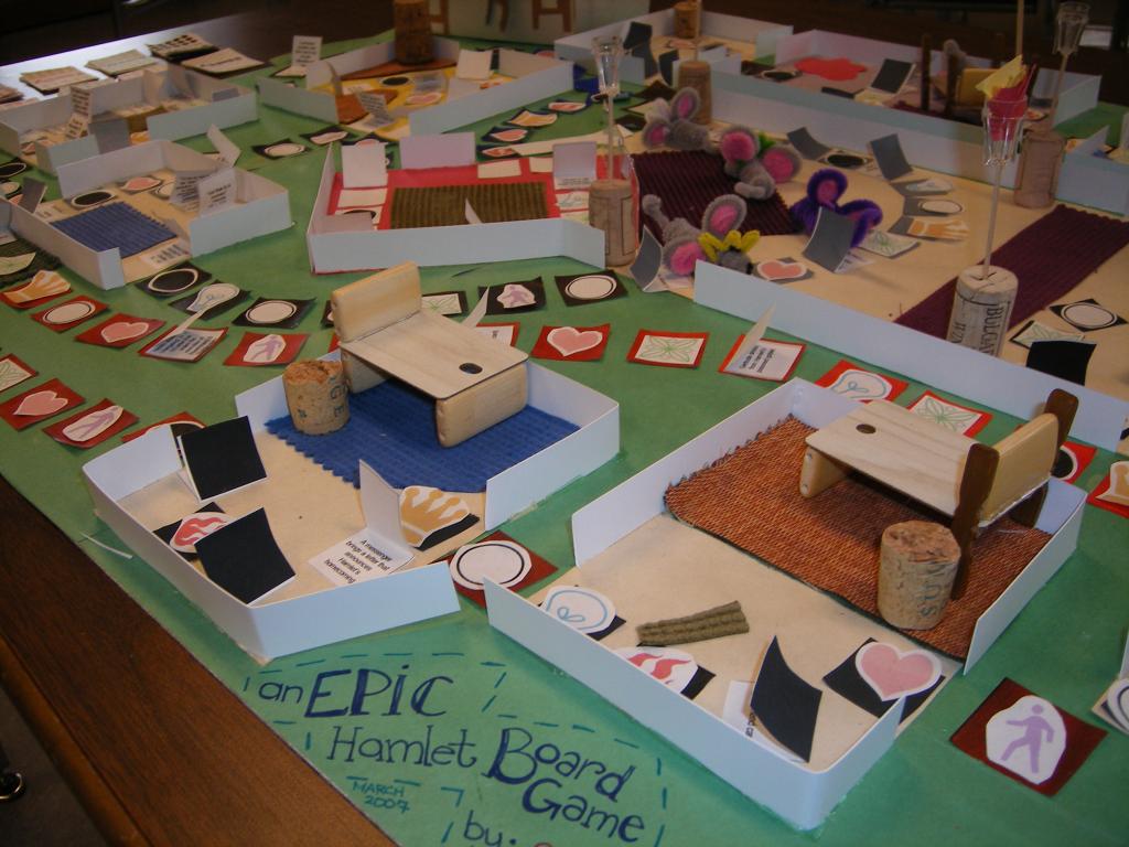 Students: Cindey Chiang, Stephanie Tsang, and Sarah Chau. Three students produced an "epic" board game that traces the development of Hamlet's conflicts throughout the play. The design of the game board is based on various settings in Elsinore Castle. As players advance, they will encounter passages from Shakespeare's text that signal some change in Hamlet's fortune; they collect cards that indicate Hamlet's level of success as a friend, a lover, a son, an avenger, a philosopher, etc. Because of the detailed references to the text and the visual layout of Hamlet's conflicts, this game would be ideal as a review of the play. The slides include a written analysis of the board game as it relates not only to conflicts but also symbols and themes in Shakepeare's play. (As an added touch, the figures of the six players allude to the "Mousetrap," the play-within-the-play.)