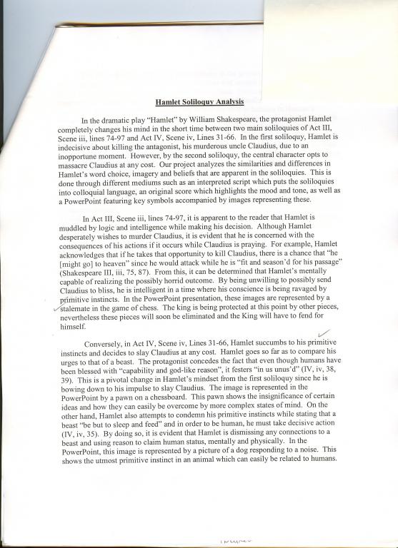 Students: Sara Clouston, Catherine Rose, Nicki Kontogiannis, Suzanne King This group produced a multimedia study comparing two of Hamlet's soliloquys: III.iii.73-96 ("Now might I do it pat..." when he contemplates killing Claudius during prayer) and IV.iv.32-66 ("How all occasions do inform against me" when Hamlet encounters Fortinbras's army). The students composed and presented a modern English translation of each soliloquy along with the musical accompaniment of a keyboard. Their PowerPoint slideshow features an essay of original photos that document the key developments in each soliloquy. See the demo for the PowerPoint show.