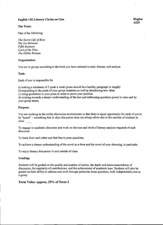Here is the Lit Circles Criteria Sheet provided to students. In it the need for regular contributions to the discussion group, the interaction between discussion members, the building of group analysis and the importance of academic voice are stressed.* click on image to view full size.